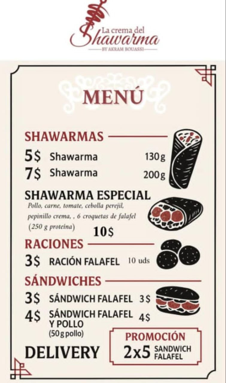El Shawarma es nuestro plato principal (pollo, carne o mixto), tambien tenemos raciones de falafel y sandwiches de falafel, sólo o combinado con pollo.